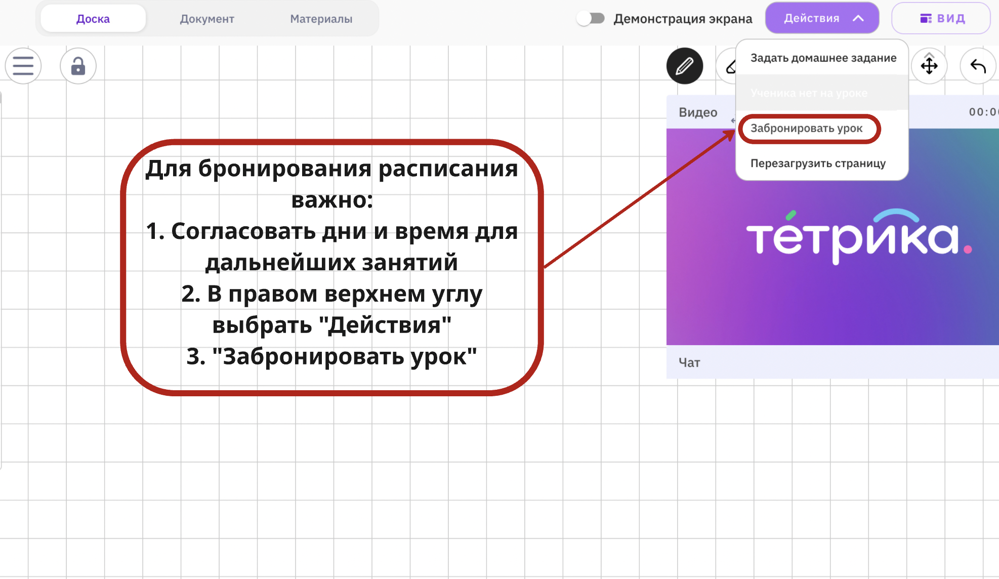 На вводном уроке вам необходимо согласовать с учеником дальнейшее расписание и забронировать не менее двух регулярных занятий. Это нужно, чтобы ученик смог продолжить с вами заниматься на постоянной основе. Если ученик купит пакет уроков, но у вас не будет свободного времени в расписании — нам придётся назначить другого преподавателя.