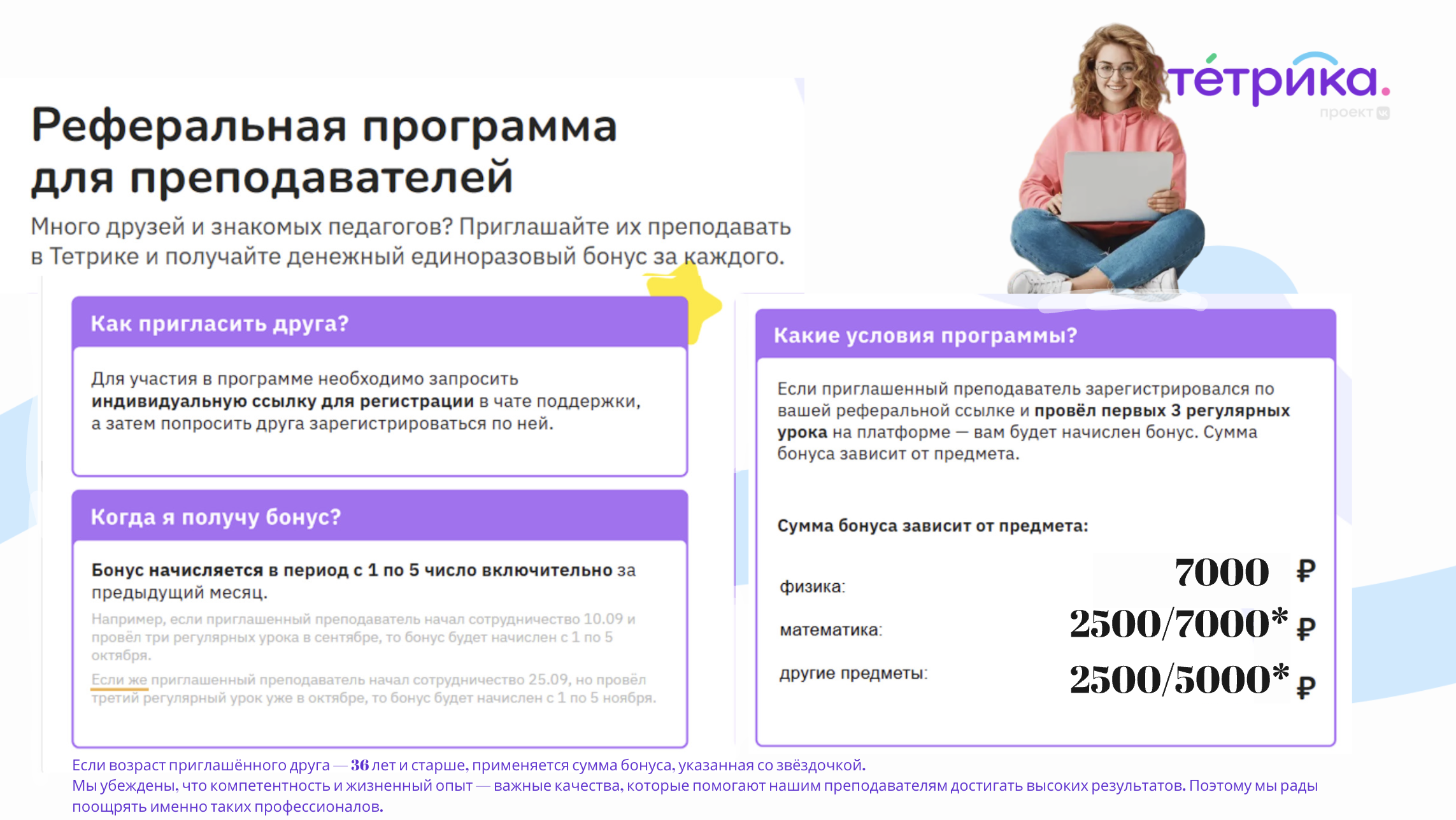📍 Много друзей и знакомых педагогов? Приглашайте их преподавать в Тетрике и получайте денежный единоразовый бонус за каждого 💸