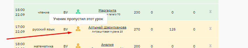 ✔ статус урока (завершен, неявка учителя или неявка ученика).