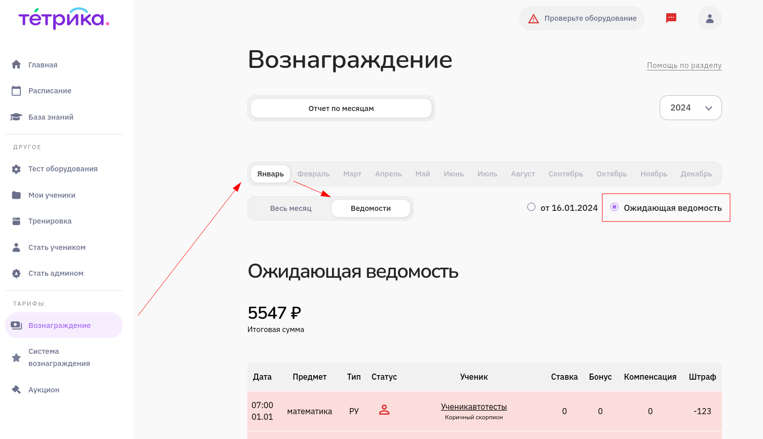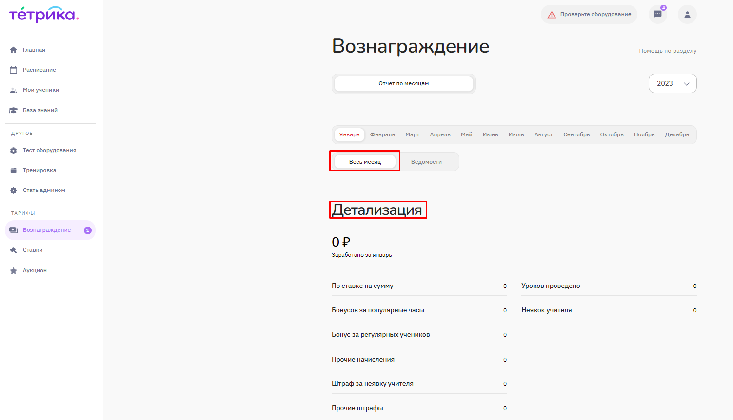 Платформа позволяет просмотреть как общую статистику по месяцу, так и детализацию по проведенным урокам за месяц, начисленным штрафам и бонусам.