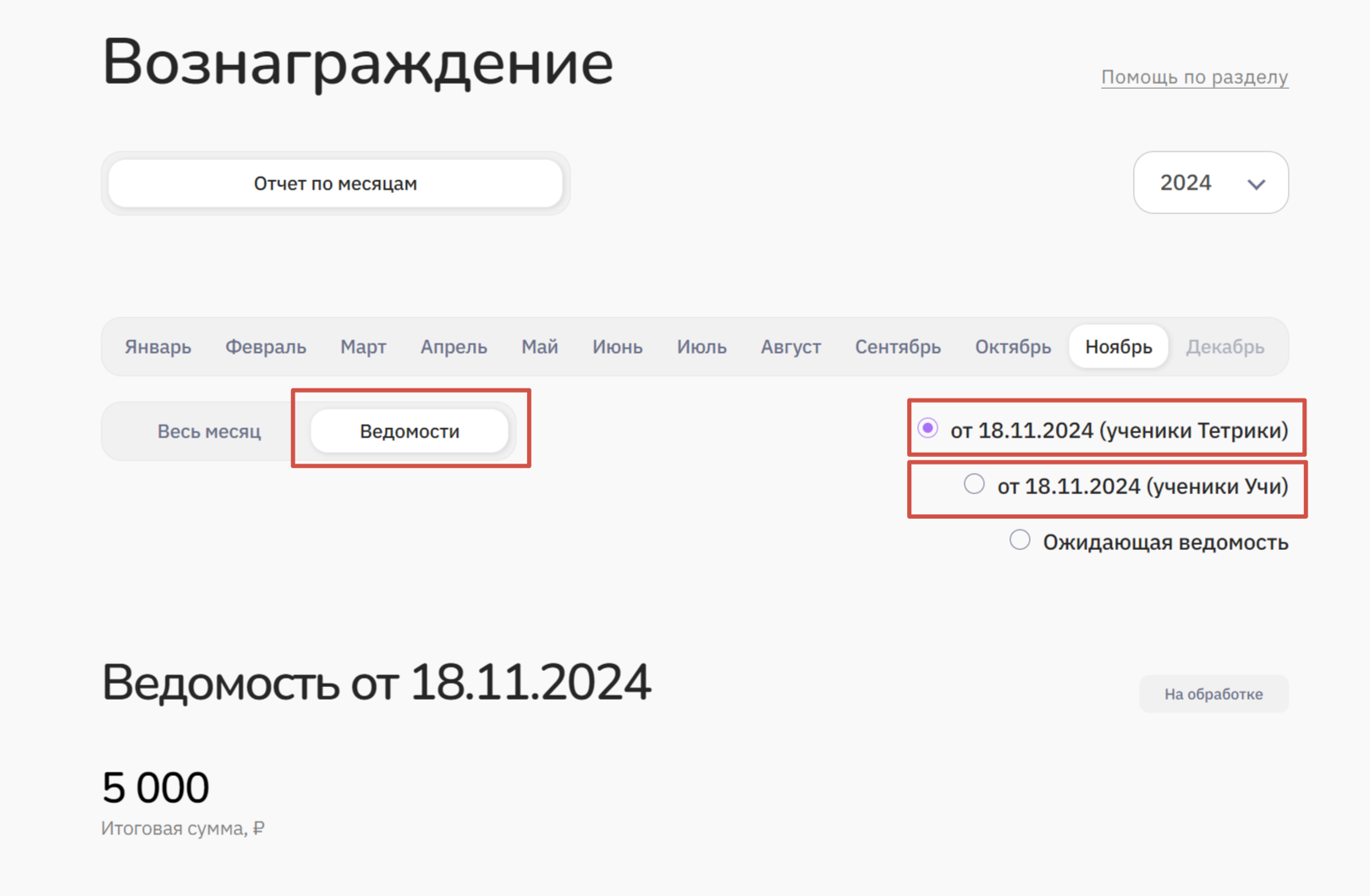 Чтобы проверить информацию по отправленному вознаграждению, нажмите на "Ведомости" и кликните на дату, от которой ведомость была сформирована.