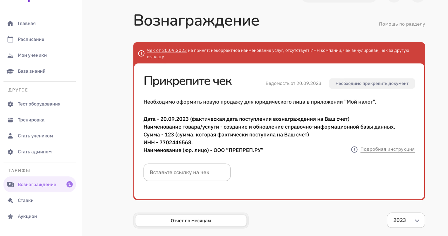 Чтобы прикрепить сформированный чек, зайдите в раздел "Вознаграждение" и вставьте ссылку на чек в соответствующее поле.