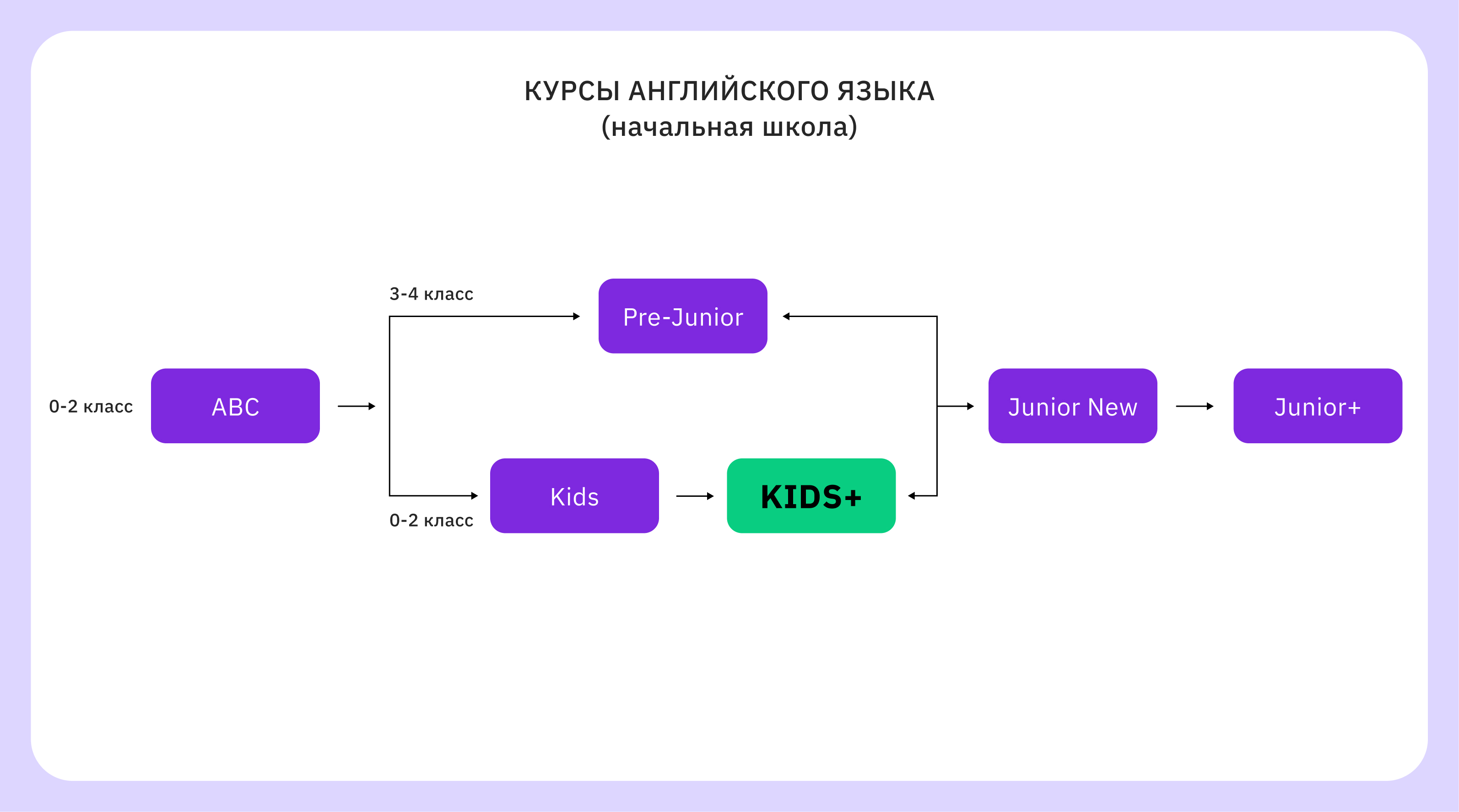 По завершении Kids ученику 0-2 класса стоит назначить Kids+. Если ученик перешёл в 3-4 класс, нужно назначить курс Pre-Junior (изучите карту курса и выберите точку входа: это не обязательно 1-й юнит и урок, так как на Kids уже частично были разобраны темы курса. Рекомендуем начинать с 3-4 юнита, но не забывайте про легенду, - презентуйте её ученику).