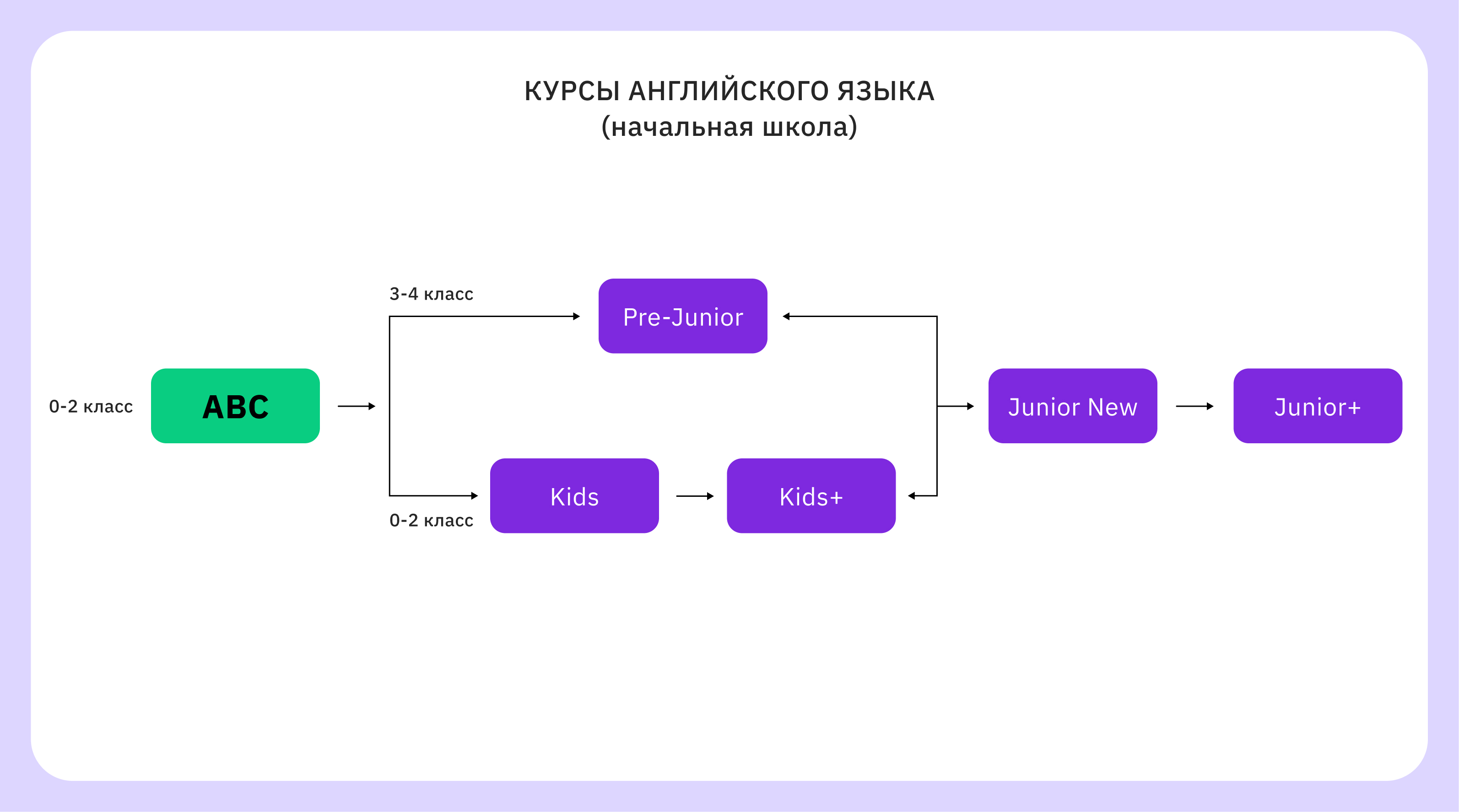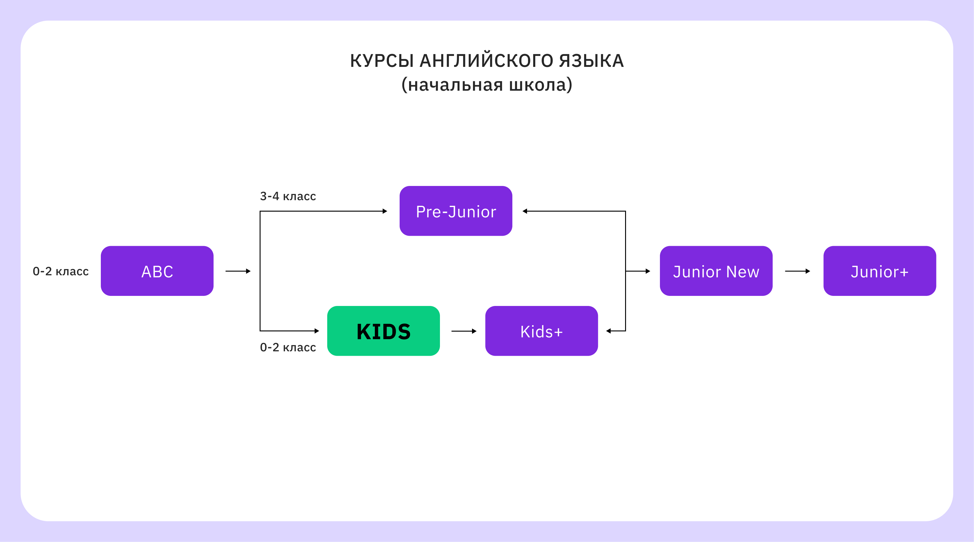 По завершении обучения на курсе ABC рекомендуем переходить к курсу Kids, если ученик обучается в 0-2 классе. Если ученик уже перешёл в 3-4 класс, после ABC ему нужно назначить Pre-Junior (подробнее о курсе можно прочитать здесь).