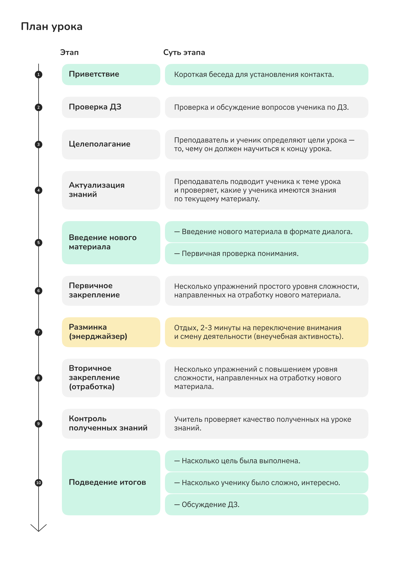 Обратите внимание, что в этом типе урока отсутствует этап "Проверка ДЗ", так как это ваше первое занятие с учеником.