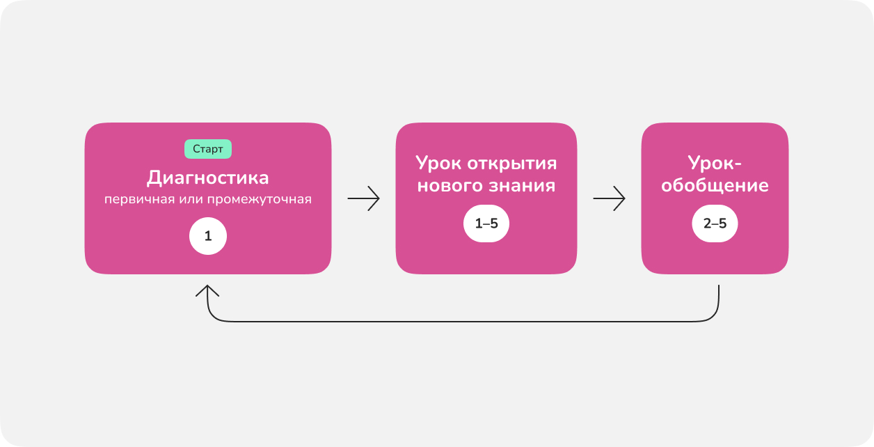 Далее снова идет урок открытия нового знания и т.д. Придерживайтесь этой схемы, чтобы обеспечить системность обучения, более устойчивые образовательные результаты и прозрачность этих результатов для ученика.