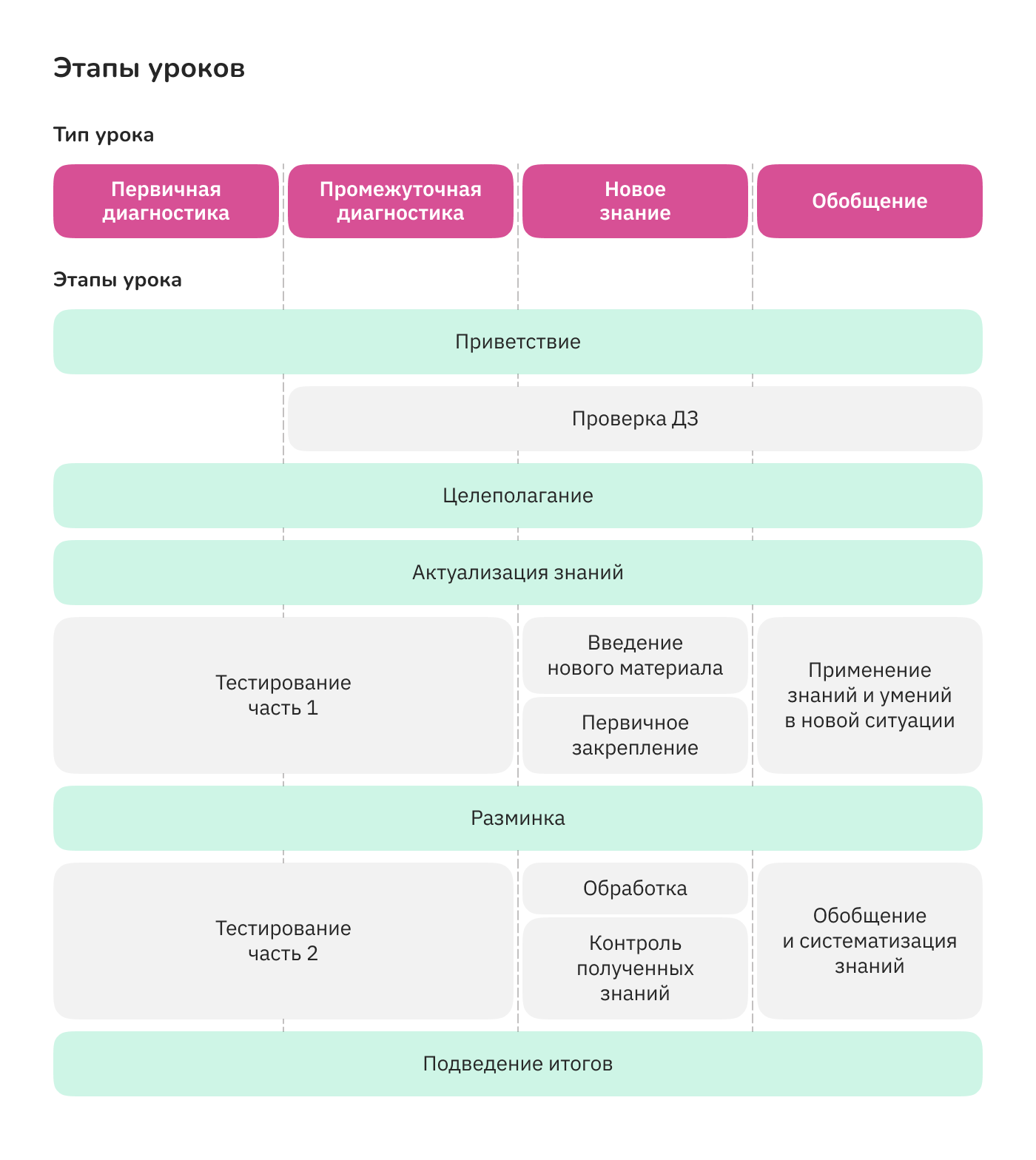 План урока зависит от типа урока. Например, для урока "Первичная диагностика" нужны следующие этапы:
