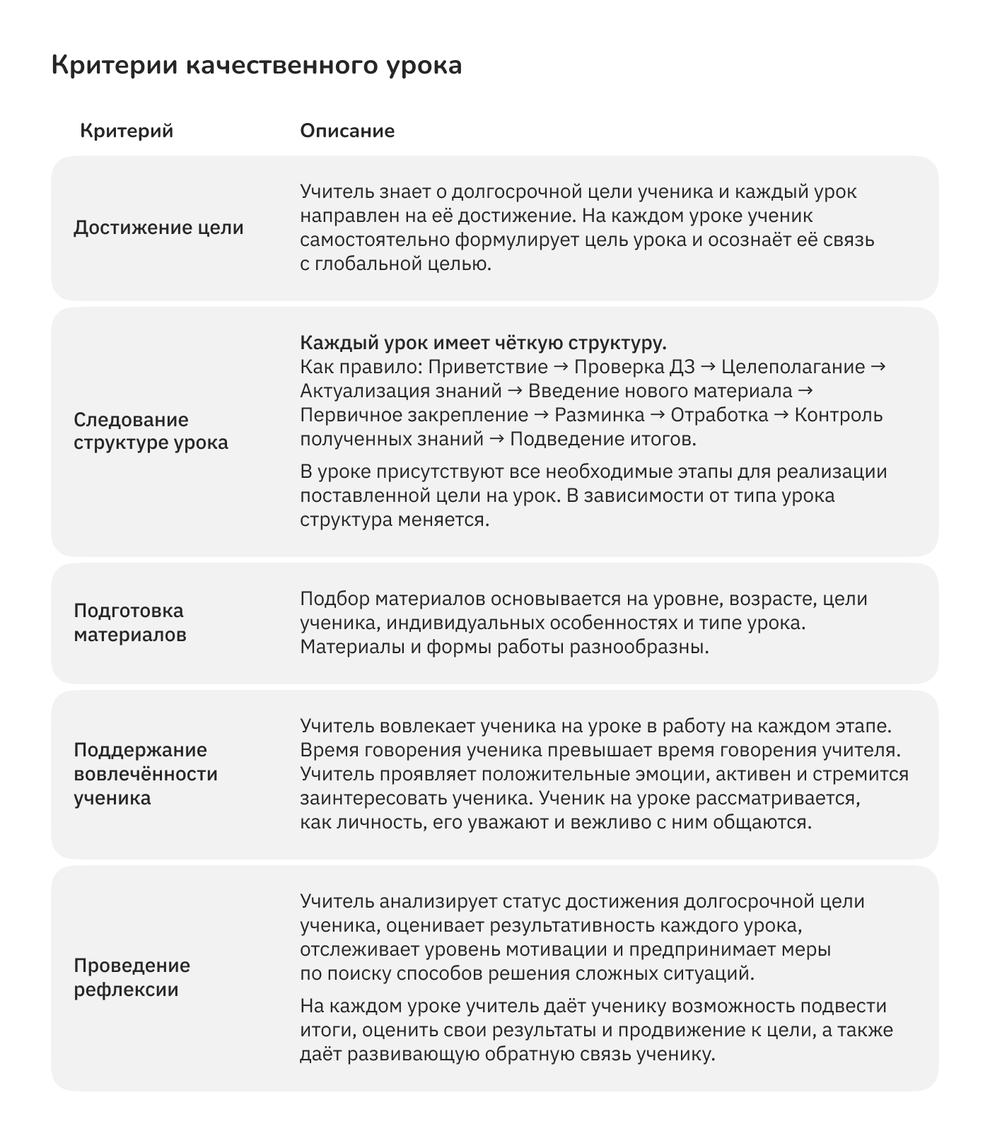 Качественный урок - урок, приближающий к цели и позволяющий ученику в комфортных условиях решить учебные задачи. Критерии такого урока и подробное описание вы найдёте ниже: опирайтесь на них при подготовке к занятиям.